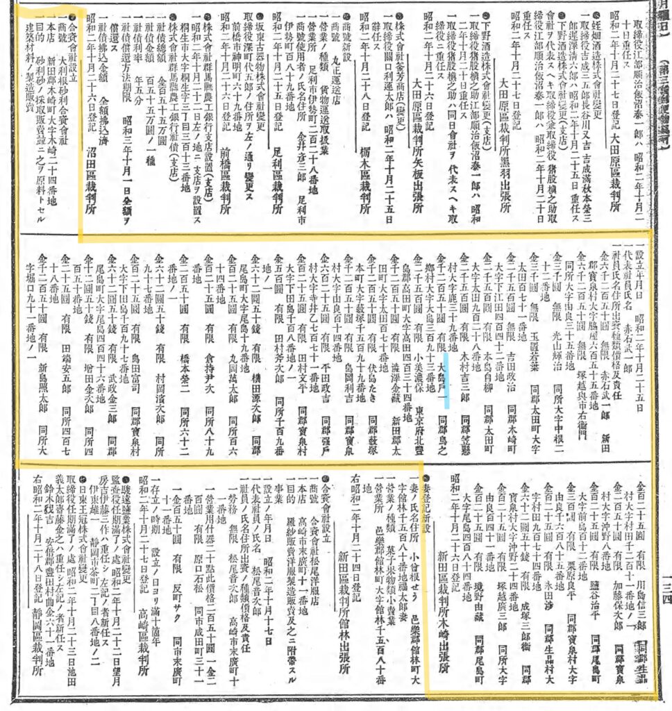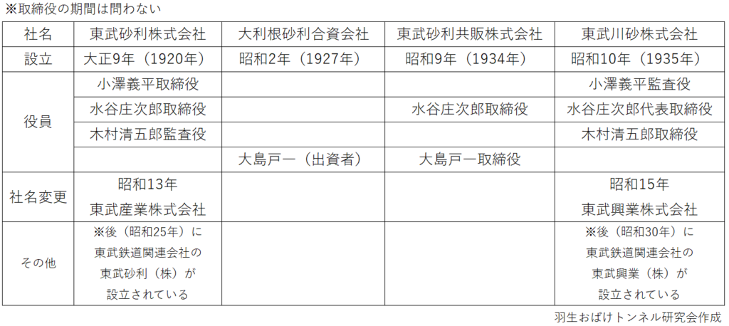 東武興業という会社が複数存在したこともそうですが、「東武砂利」という会社も複数存在していたり、東武鉄道を巡る砂利業者の関係は非常に複雑です。東武興業(東武川砂)の設立時の代表取締役だった水谷庄次郎氏と、大島戸一氏は前年に同じ会社の役員だったことがわかります。つまり接点はあったんです。