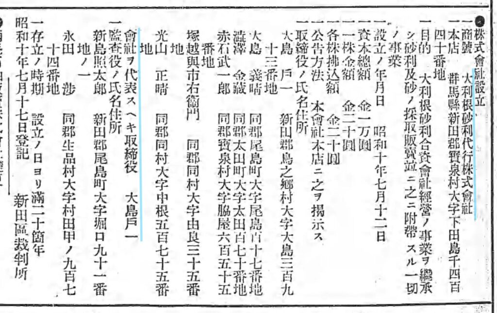 ところがこの大島戸一氏は非常に興味深い方で、後で詳しく取り上げたいと思いますが、当時の”群馬県多額納税者”とも言われた方で、昭和2年に「大利根砂利合資会社」の設立に関わり、昭和10年には「大利根砂利代行株式会社」の代表取締役となったりしているのです。