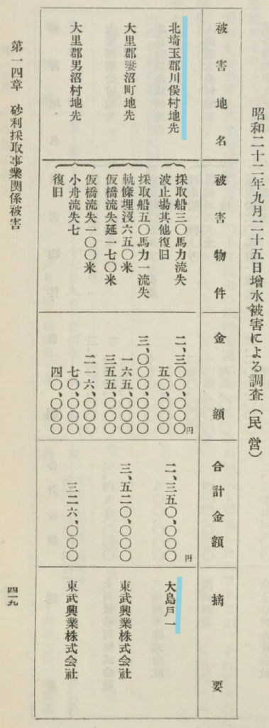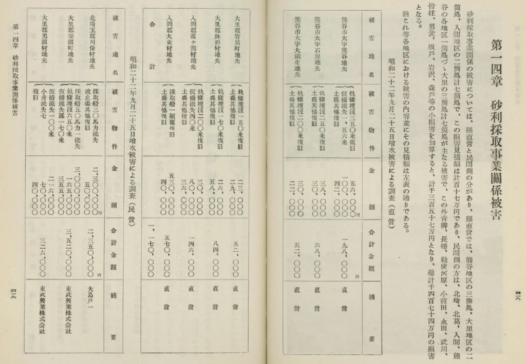 昭和22年のカスリーン台風では、利根川の決壊を含め多大な被害が記録されています。利根川における砂利採取にも大きな影響があったことが、「埼玉縣水害誌」の「第十四章 砂利採取事業関係被害」にまとめられており、“民営”の方に大変興味深い記載がありました。